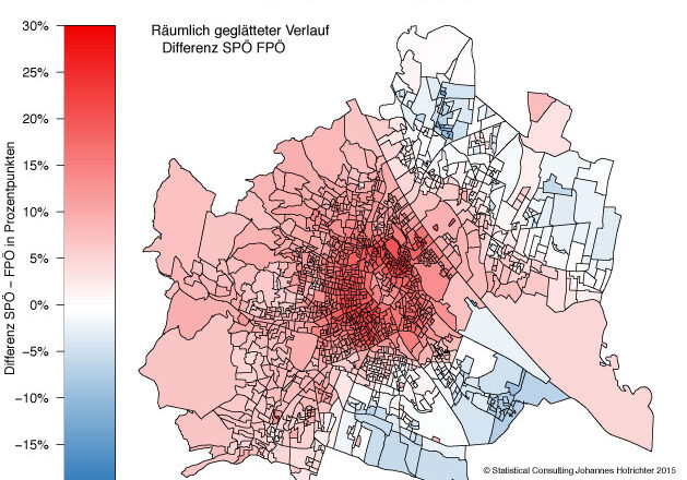 Am 11.10.2015 fanden in Wien Gemeinderatswahlen statt und ich dachte mir, es ist Zeit für eine alternative Darstellung der Verteilung der Wählerstimmen: Weg vom Fleckerlteppich, hin zu einer räumliche glatten Verteilung. Die Grafiken zeigen den relativen Anteil der Wählerstimmen pro Partei bezogen auf die insgesamt abgegebenen Stimmen an. Die Sättigung der Farbe gibt die Höhe […]